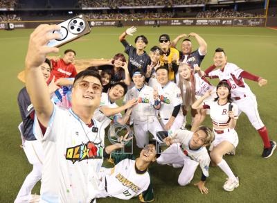 2025中職明星賽19日登場,邀請6隊、逾百人的應援團隊帶動場邊氣氛。其中樂天桃猿資深應援團長阿誠(前左)今年卸下團長身分,這也是他最後一次以應援團長之姿參與明星賽,賽後與各隊應援團成員合影留念。