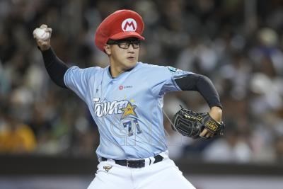 中華職棒明星賽今年跨界合作日本任天堂,20日在台北大巨蛋迎來第2戰,TEAM TAIWAN派投手莊昕諺(圖)中繼登板,莊昕諺戴著瑪利歐帽子投球。