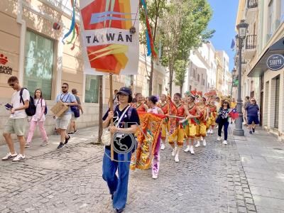 新北市方相舞蹈團日前參加西班牙藝術節,在巴達霍斯市等地踩街與演出、交流舞蹈,遊行隊伍手舉台灣名牌前行,以「跳鼓陣」等傳統民俗呈現廟會熱鬧景象。