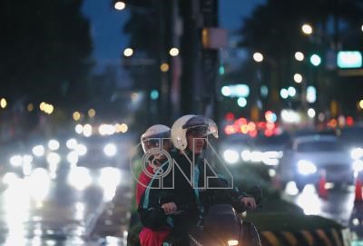 大台北地區1日傍晚下午雷陣雨,雨勢一直持續至入夜都還沒完全停止,街頭民眾穿起雨衣騎車穿梭在車陣中。