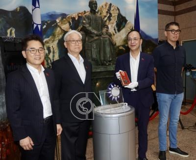 國民黨主席朱立倫(右2)13日下午在中央黨部出席「抗戰勝利暨台灣光復80週年紀念展」揭幕儀式,與黨副主席夏立言(左2)、連勝文(右)、秘書長黃健庭(左)一起為展覽揭幕。