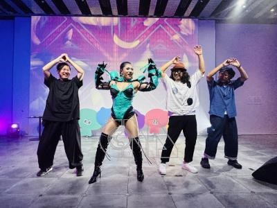 「We TAIWAN台灣文化in大阪.關西世博」16日晚間舉辦「a-We之夜」,變裝皇后Tina Banana(左2)驚喜登場,一身「a-We綠」服裝與觀眾共舞。
