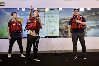 為提升國人海域遊憩安全,交通部中央氣象署20日舉辦「AI守浪.預見風險—海岸異常波浪早期預警」記者會,正式發表智慧海象預報的最新成果,圖為發表會上氣象署員工自導自演波浪早期預警小短劇。