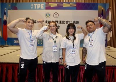 中央社記者張皓安攝 114年8月21日###0001滑輪溜冰選手劉巧兮0002健力選手楊森(右)、江凱傑(左),滑輪溜冰選手劉巧兮(右2)、女子拔河隊長田嘉蓉(左2)0003健力選手楊森(右)、江凱傑(左),滑輪溜冰選手劉巧兮(右2)、女子拔河隊長田嘉蓉(左2)###
