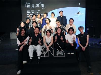 為女性詩人零雨(後右2)籌備的全新詩歌跨界企畫「聽見零雨」21日在台北舉辦發表會,包括和碩董事長童子賢(後右)、金曲歌后羅思容(後右3)等人出席合影。