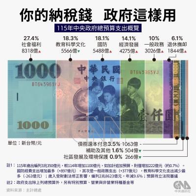 行政院會21日通過「115年度中央政府總預算案暨附屬單位預算及綜計表」,受新版財劃法影響,編列歲入為新台幣2兆8623億元,較114年度大幅減少3025億元,歲出編列3兆350億元,整體歲入歲出相抵差短1727億元。中央社製圖114年8月21日