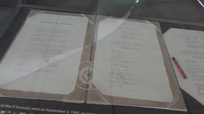 美國海軍密蘇里號戰艦上陳列1945年9月2日日本代表重光葵簽署的投降文件,盟軍統帥麥克阿瑟、中華民國代表將軍徐永昌與盟軍代表分別簽字。