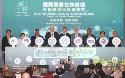 「2025國際警察合作論壇-打擊跨境犯罪研討會」2日上午在台北登場,行政院長卓榮泰(後中)、美國在台協會(AIT)處長谷立言(後右4)、內政部長劉世芳(後左2)等人共同主持啟動儀式 。