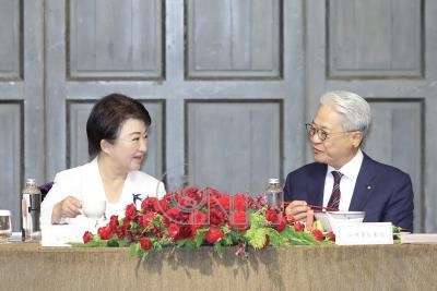 中華民國工商協進會理監事聯席會3日在台北君品酒店舉辦,工商協進會理事長吳東亮(右)與台中市長盧秀燕(右)於演講前聊天互動。