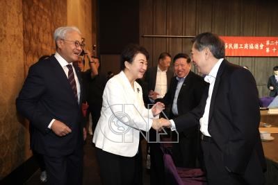 工商協進會理監事聯席會3日在台北君品酒店舉辦,台中市長盧秀燕(前中)出席與現場貴賓握手致意。