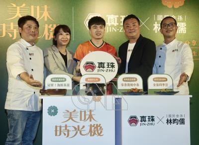 桌球好手林昀儒(中)與台菜餐廳合作,5日在台北舉行記者會,推出4道林昀儒與家人的回憶限定料理,傳承台菜美好滋味。