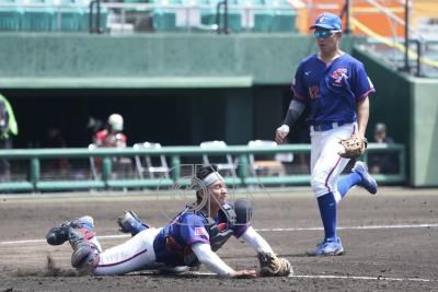 U18世界盃棒球賽台灣季軍戰14日與韓國交手,3局下,台灣捕手江庭毅撲接內野飛球。