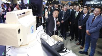 台北國際航太暨國防工業展(TADTE)18日在台北南港展覽館1館舉行,立法院副院長江啟臣(前右1)、中華民國對外貿易發展協會董事長黃志芳(前右2)與、國防部長顧立雄(前右3)聽取漢翔代理董事長曹進平(前左)介紹雷射硬殺系統。