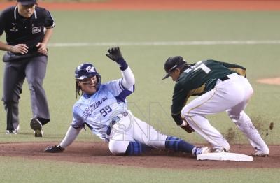 中職大巨蛋悍將戰雄鷹 張育成盜壘成功