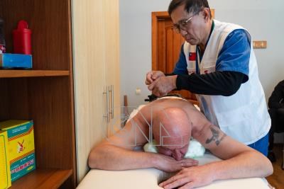 馬偕紀念醫院醫療團日前第六度前往烏克蘭進行義診與醫療教育交流,短短6天的義診內,團隊接待超過650人次。圖為9月24日中醫部主任陳光偉為下半身癱瘓的傷兵根納季進行針灸治療。