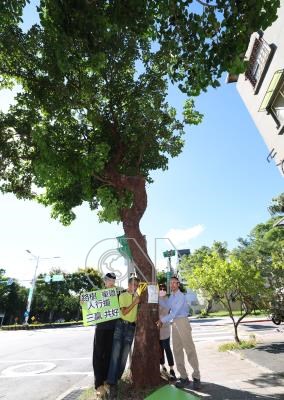 台北市工務局公園路燈工程管理處打算移植塔悠路332號路口路樹,撫遠公園護樹聯盟召集人陳進旺(右1)、台灣樹人會祕書長潘翰疆(左2)與行人零死亡推動聯盟理事林柏勛(左1)等人3日舉辦記者會,呼籲保留老樹。