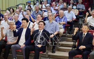 「軍系挺好的!」記者會3日在台北舉行,國民黨主席候選人郝龍斌(前排左3)、前中廣董事長趙少康(前排左2)與出席退役將領一同振臂喊口號,加油打氣。