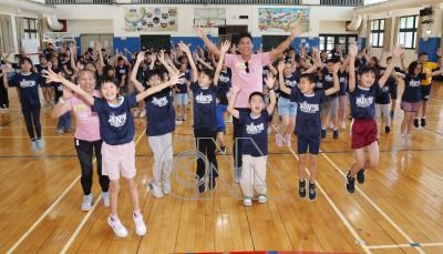 「樂動150,全齡動起來」宣導記者會3日在台北信義國小活動中心舉行,推廣大使柯有倫(中,粉紅色上衣)號召學童與家長從日常生活開始養成運動好習慣。