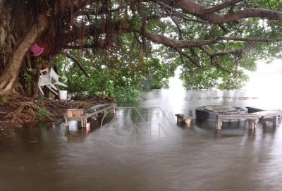 受豪大雨、抽水站抽水及大潮影響,新北市二重疏洪道20日部分區域道路嚴重積淹水,原本在大樹下供民眾乘涼休息的桌椅擺設處也成了一片汪洋。