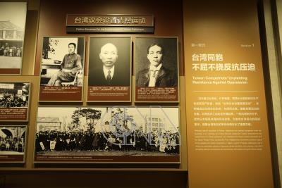中國人民抗日戰爭紀念館25日舉行「台灣同胞抗日史實展」開幕式。圖為該展覽陳列台灣議會設置請願運動相關介紹。