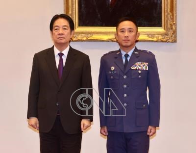 總統賴清德(左)29日在總統府主持中華民國114年11月份將官晉任授階典禮,空軍上校羅偉中(右)晉任空軍少將。