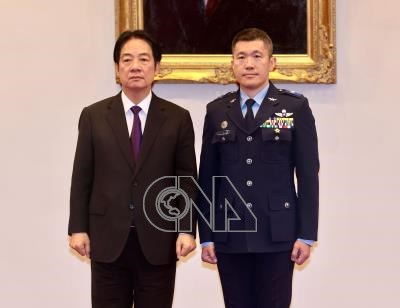 總統賴清德(左)29日在總統府主持中華民國114年11月份將官晉任授階典禮,空軍上校胡志華(右)晉任空軍少將。