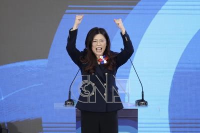 中國國民黨第22屆第1次全國代表大會1日上午在台北成功高中體育館舉行,新任黨主席鄭麗文(圖)上任致詞後高舉雙手歡呼。