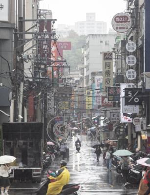 颱風鳳凰逼近台灣,氣象署11日表示,12日到13日是鳳凰最接近的時候,預期鳳凰逐漸靠近台灣西南方海域並轉向東北方向移動,12日傍晚到晚間就會登陸高屏,13日清晨從台東出海。圖為11日新北市淡水區英專路出現陣雨,民眾撐傘外出。
