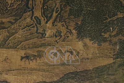國立故宮博物院鎮院3國寶北宋范寬「谿山行旅圖」、郭熙「早春圖」與李唐「萬壑松風圖」11日首度於故宮南部院區展出,圖為「谿山行旅圖」局部,右側樹葉間可見范寬簽名。