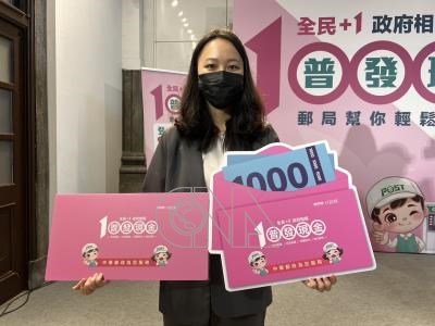 普發現金新台幣一萬元上路,中華郵政13日表示,24日將開放全台郵局臨櫃領現,另以普發現金主視覺設計特製精美紅包袋,將贈送臨櫃領現民眾紀念收藏。