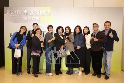 第24屆卓越新聞獎頒獎典禮18日下午在台北舉行,中央通訊社分別入圍單張新聞攝影獎、新聞敘事創新獎、藝術與文化新聞獎,中央社社長胡婉玲(左5)與入圍者一同合影留念。