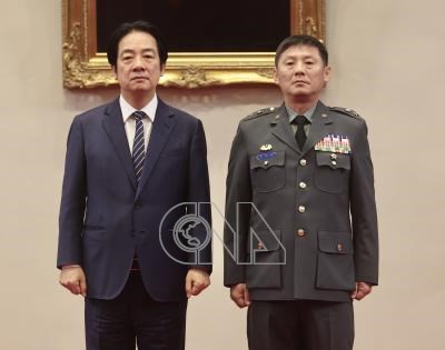 總統賴清德(左)25日在總統府主持中華民國114年12月份將官晉任授階典禮,陸軍花東防衛指揮部指揮官黃超政(右)晉任陸軍中將。