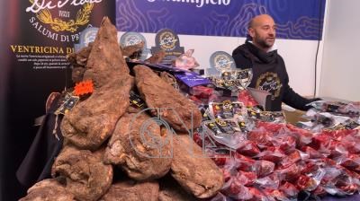 義大利拉奎拉松露美食展有許多市面罕見的小農商品,例如圖片左方這些以椒鹽包覆醃製長達1年的豬頰肉。