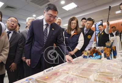 台灣高等檢察署與法務部調查局2日上午共同舉辦2025年「第13波安居緝毒暨重大毒品案件」成果記者會,行政院長卓榮泰(前左)出席視導台越跨境合作查獲雙獅牌海洛因磚52塊案件成果。