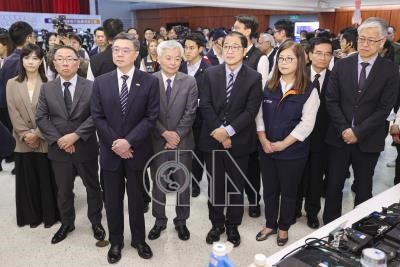 台灣高等檢察署與法務部調查局2日上午共同舉辦2025年「第13波安居緝毒暨重大毒品案件」成果記者會,行政院長卓榮泰(左3)、政務委員林明昕(左2)、法務部長鄭銘謙(左5)等人出席,會中一同聆聽簡報。