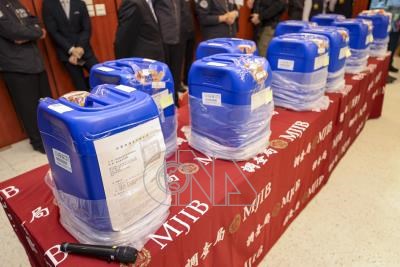 台灣高等檢察署與法務部調查局2日上午共同舉辦2025年「第13波安居緝毒暨重大毒品案件」成果記者會,會中展示高雄地檢署偵辦破獲自中國地區以「矽油」名義申報進口貨品,實際為列管毒品「喵喵」原料「1-甲基苯基-1-丙酮」10桶,淨重約247.26公斤。