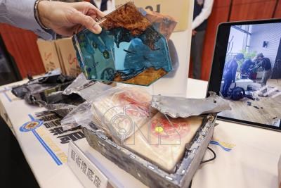台灣高等檢察署與法務部調查局2日上午共同舉辦2025年「第13波安居緝毒暨重大毒品案件」成果記者會,會中展示刑事局跨境運毒案成果,查獲以「藝術燈」為名寄送來台的包裹,底座暗藏雙獅地球牌海洛因磚,共計52塊、重19.875公斤。