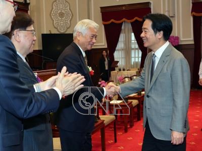 總統賴清德(右)11日在總統府接見第27屆國家建築金質獎及第22屆國家品牌玉山獎得獎代表,與德運建設董事長林財于(前右2)、台灣企銀董事長李嘉祥(前右3)等握手致意。