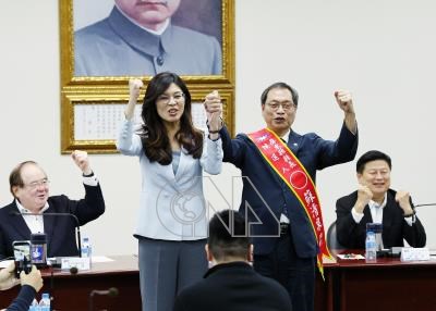 國民黨中常會24日通過首波2026年縣市長提名作業,徵召立委蘇清泉(前右)參選屏東縣長,黨主席鄭麗文(前左)帶領高喊勝選口號。