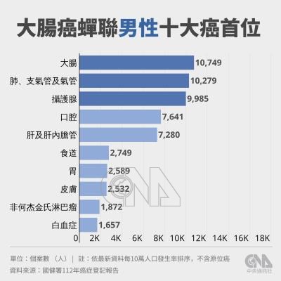大腸癌蟬聯男性10大癌首位