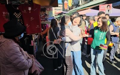民進黨新北市長參選人、立委蘇巧慧(前右2)持續勤跑基層拜票,4日到蘆洲向市場攤商及採買民眾拜票獲歡迎,場面熱烈。