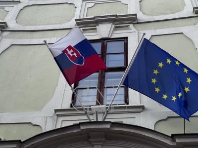 斯洛伐克國旗(左)以白、藍、紅三色橫條為底,並在中央加入斯洛伐克國徽,該國徽以雙十字架立於三座藍色山峰之上,明確區別於捷克所沿用的捷克斯洛伐克國旗。圖片攝於113年12月18日。