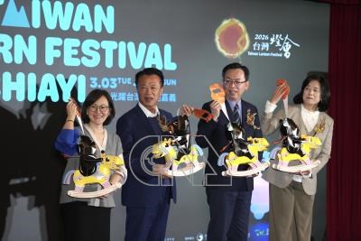 交通部觀光署9日在台北圓山大飯店舉行2026台灣燈會主燈暨小提燈造型發表記者會,觀光署長陳玉秀(右起)與交通部次長林國顯、嘉義縣長翁章梁、小提燈設計師林佳葦一起拿著「喔熊馬抵嘉」小提燈合影。