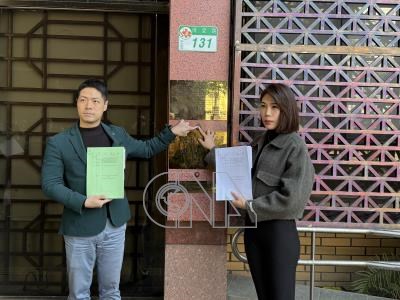 有意參選台北市議員的馬郁雯(右)、陳又新(左)9日到台灣台北地方檢察署,按鈴告發中國國民黨籍立法委員陳玉珍涉施壓中華電信股份有限公司喬人事,涉貪污治罪條例等罪。