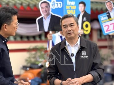 泰國最老牌的政黨民主黨總理候選人艾比希(Abhisit Vejjajiva)8日在曼谷的中國城掃街造勢,與為泰黨造勢晚會互別苗頭。