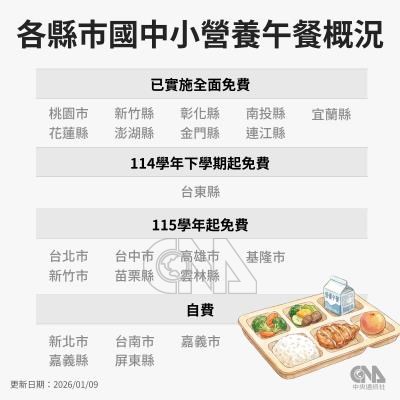 台北市、基隆市、台中市、高雄市、新竹市、雲林縣近日相繼宣布115學年度免費營養午餐政策。新北市長侯友宜呼籲中央應有統一性政策,避免縣市落差。行政院發言人李慧芝8日表示,新版財劃法大幅削弱中央政府財政能力,中央今年度要舉債3000億元,並無餘裕協助地方。 中央社製圖 115年1月9日