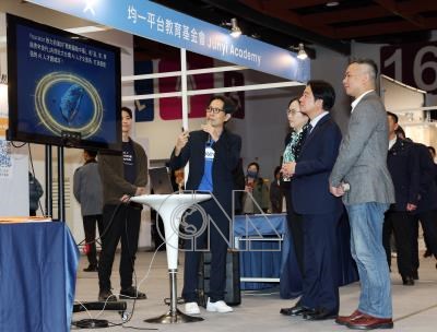 總統賴清德(右2)10日上午出席「2026 AI人才年會」致詞合影,隨後參訪展示攤位