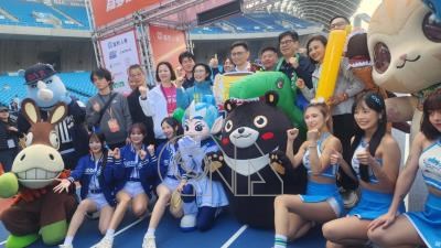 2026高雄富邦馬拉松16週年10日開跑,市長陳其邁(恐龍裝者)與角逐市長初選參選人、高雄熊、蜜柑站長等人氣吉祥物,以及Fubon Angels、海神啦啦隊女孩及恐龍們共同合影,場面溫馨熱鬧。