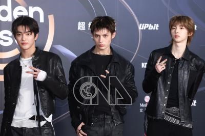 韓國音樂界的年度盛事「金唱片」頒獎典禮10日首次移師台北大巨蛋舉行,男團CORTIS成員趙雨凡(中)與團員們會前在紅毯帥氣亮相。