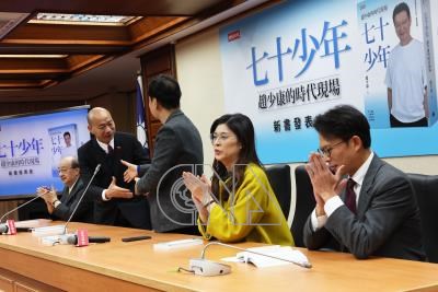 立法院長韓國瑜(左2)出席前中廣董事長趙少康自傳回憶錄「七十少年:趙少康的時代現場」新書發表會,並在致詞後與趙少康(右3)握手致意。